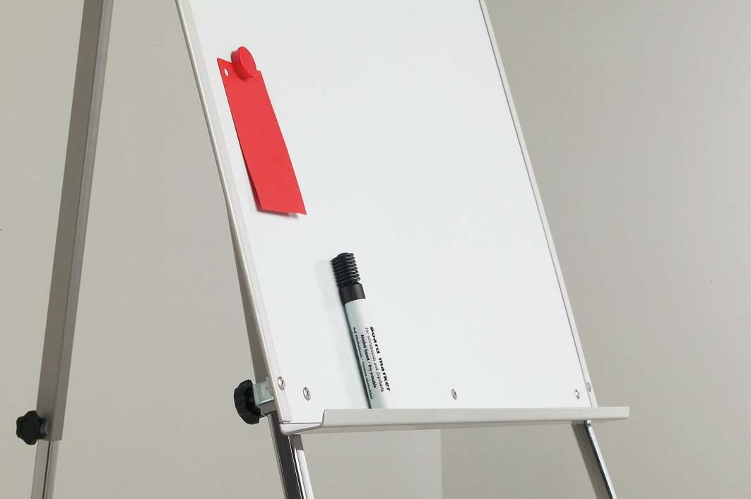 Basismodel uit gelakt staal met flexibel instelbare schroefknoppen. Geschikt voor elk soort flip-overpapier. Voorzien van inschuifbare poten en afleggoot.