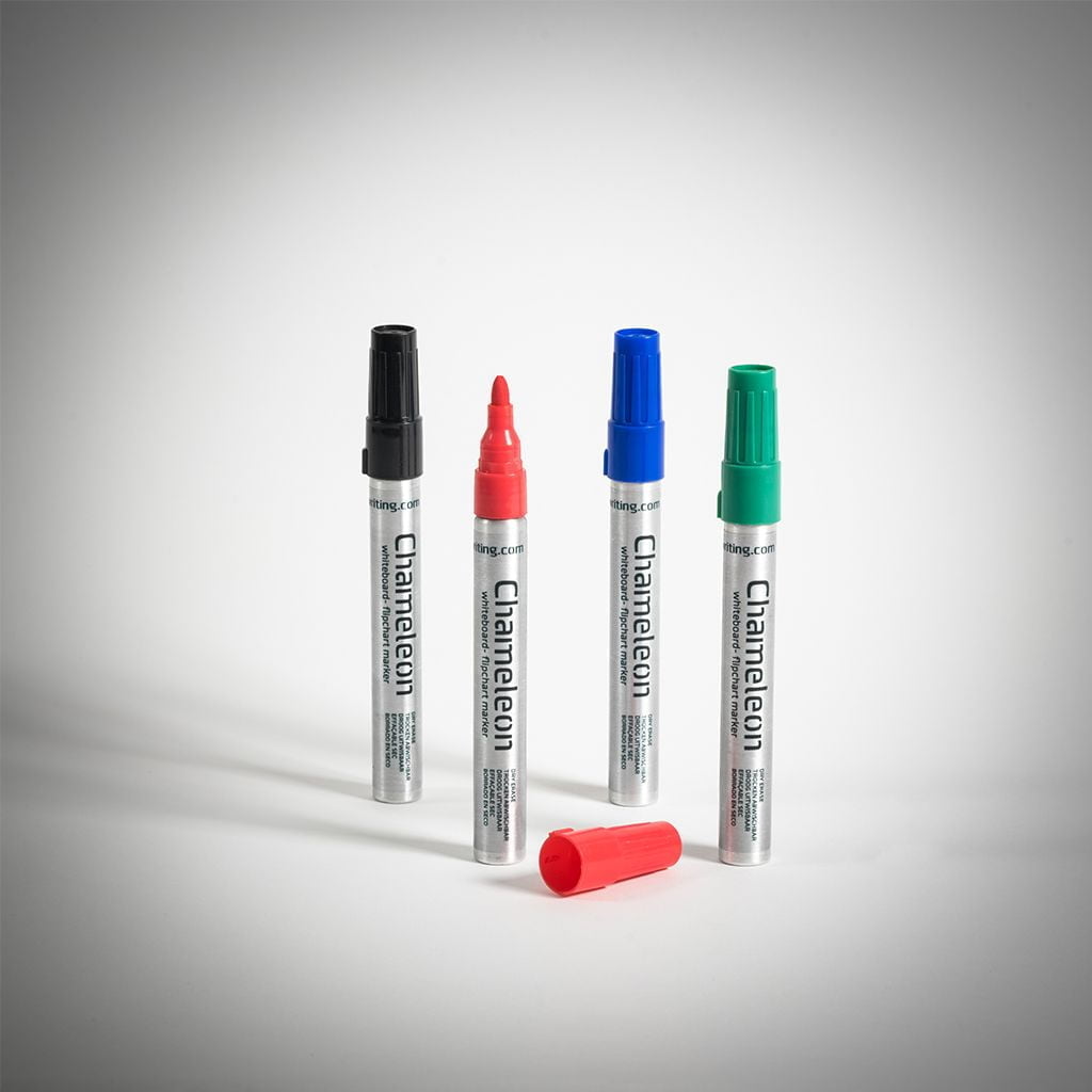 Magnetische markerset voor whiteboards, set van 4, zwart, rood, blauw en groen.